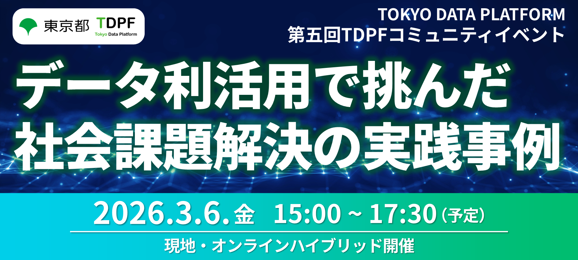 東京データプラットフォーム(TDPF)では、公共性の高い分野を中心に、社会課題やその解決につながるソリューションを会員間で共有し、コミュニティの活性化を図ることで、新たなサービスの創出を後押しする取組を行っており、その活動の一環で会員向けコミュニティイベントを実施しております。